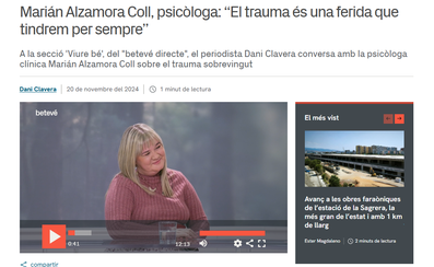 Nuestra codirectora y psicóloga especialista en Trauma participa en el programa de televisión en directo en Betevé "Viuré Bé" para hablar sobre el Trauma. Hablamos de que es el trauma, como se genera, que consecuencias tiene y completamos con la diferenciación de los diferente tipo de trauma y hablamos también del trauma y del trauma complejo. Una experiencia muy enriquecedora. Es super importante dar visibilidad pública a la salud mental!